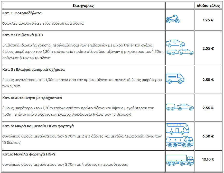 Κατηγορία 6 – Μεγάλα φορτηγά: συνολικού ύψους μεγαλύτερου των 2,70m με 4 άξονες ή περισσότερους – Από 10,00 ευρώ → 10,10 ευρώ.
