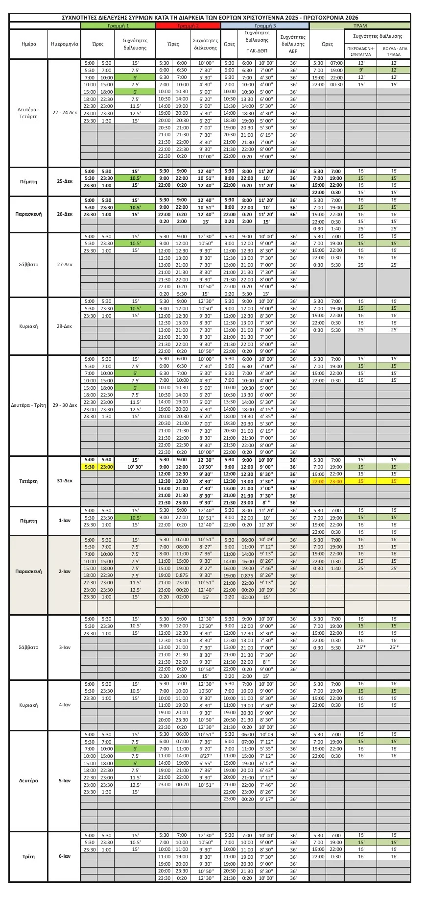 Οι συχνότητες δρομολογίων των μέσων σταθερής τροχιάς (Γραμμές Μετρό 1, 2, 3 και Τραμ) κατά τις ημέρες των εορτών: