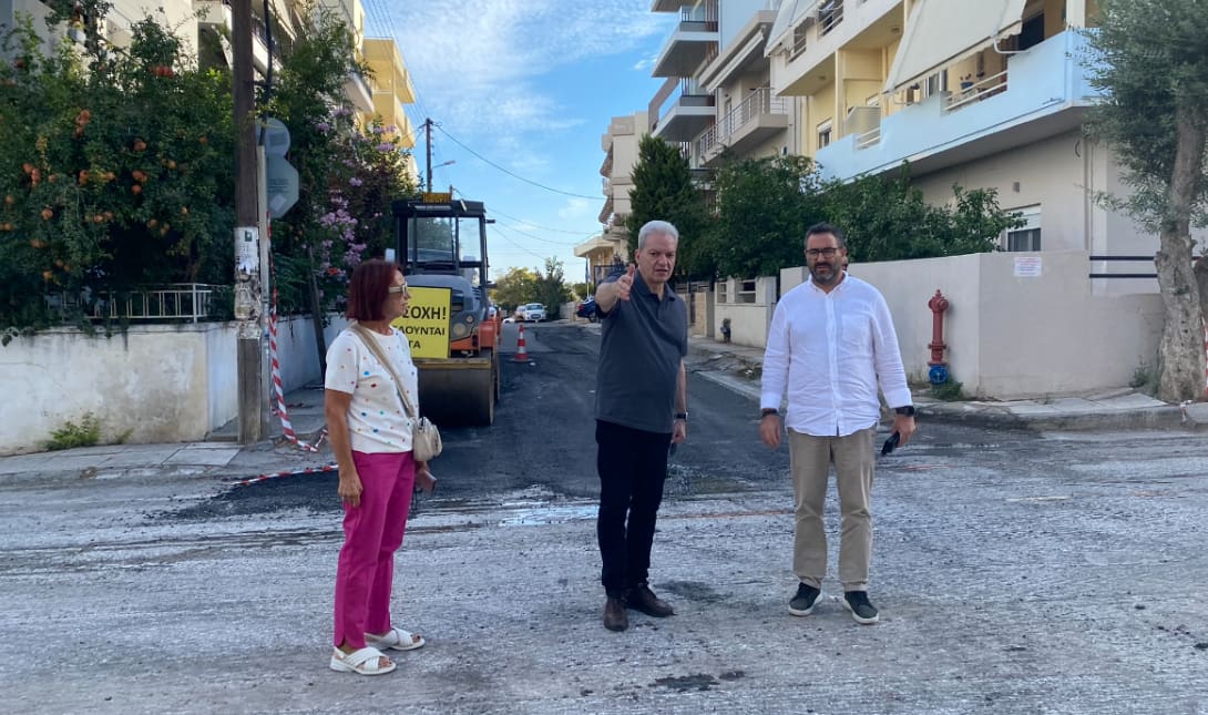 Αυτοψία του Δημάρχου Ηρακλείου, Αλέξη Καλοκαιρινού, μαζί με τον Αντιδήμαρχο Τεχνικών Έργων Γιώργο Σισαμάκη και την Πρόεδρο της 4ης Δημοτικής Κοινότητας Δωροθέα Βρούχου στις εργασίες ασφαλτόστρωσης που πραγματοποιούνται στην περιοχή του Μασταμπά.