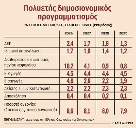 Η επιβράδυνση είναι προφανώς αποτέλεσμα της μείωσης των επενδύσεων, σε μεγάλο βαθμό. Η κυβέρνηση προβλέπει αύξησή τους κατά 10,2% φέτος και στη συνέχεια υποχώρηση του ρυθμού στο 4,1% το 2027, 0,9% το 2028 και 0,8% το 2029. Κι αυτό είναι φυσικό, αφού τα 7,192 δισ. ευρώ των επενδυτικών δαπανών του Ταμείου Ανάκαμψης το 2026 δεν θα υπάρχουν τα επόμενα χρόνια.