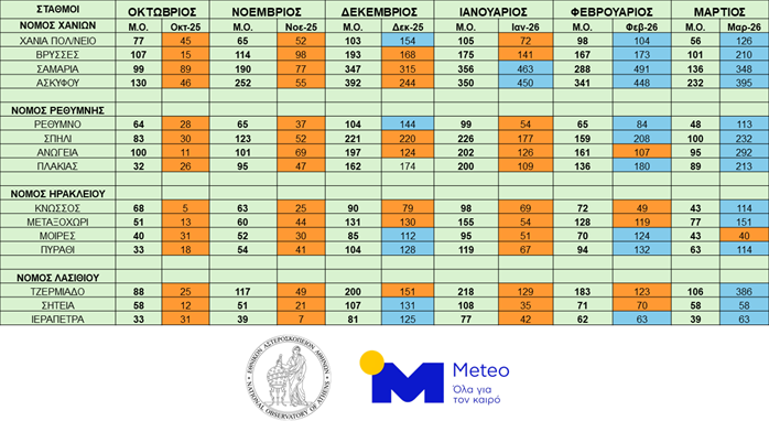 Η αριστερή στήλη (ΜΟ) σε κάθε μήνα δίνει τον μέσο όρο μηνιαίου ύψους βροχής (για την περίοδο λειτουργίας κάθε σταθμού), ενώ η δεξιά στήλη το αθροιστικό ύψος βροχής των μηνών Οκτωβρίου 2025 – Μαρτίου 2026. Με πορτοκαλί χρώμα σημειώνονται οι σταθμοί με βροχή χαμηλότερη του μέσου όρου, ενώ με γαλάζιο οι σταθμοί με βροχή υψηλότερη του μέσου όρου.
