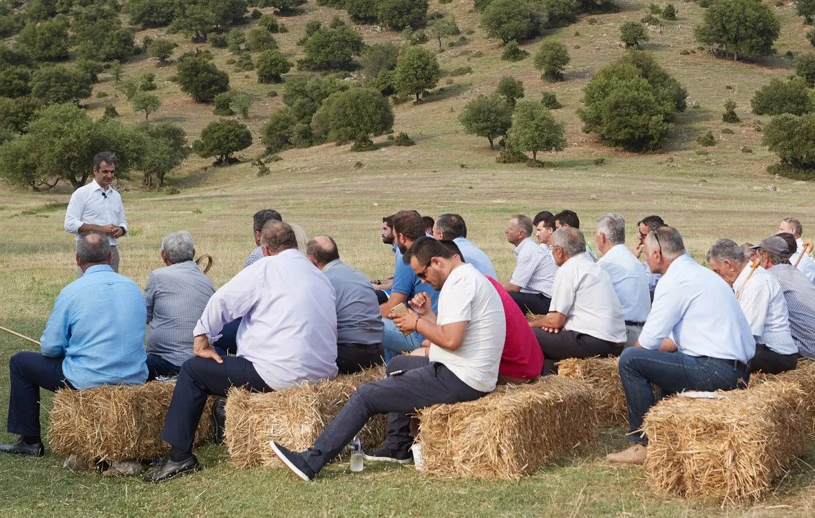 Πήγε σε χωράφι στη Λάρισα και(όχι, δεν ξεσήκωσε τους κολίγους σαν σύγχρονος Μαρίνος Αντύπας, αλλά) μίλησε σε μια επιλεγμένη ομάδα «γαλάζιων» αγροτών που κάθονταν πάνω σε μπάλες σανού!