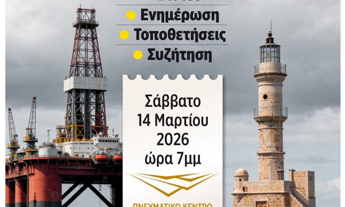 Η Πρωτοβουλία Κρήτης διοργανώνει εκδήλωση ενάντια στις εξορύξεις υδρογονανθράκων στο Πνευματικό Κέντρο στα Χανιά το Σάββατο 14 Μαρτίου στις 19:00 το απόγευμα