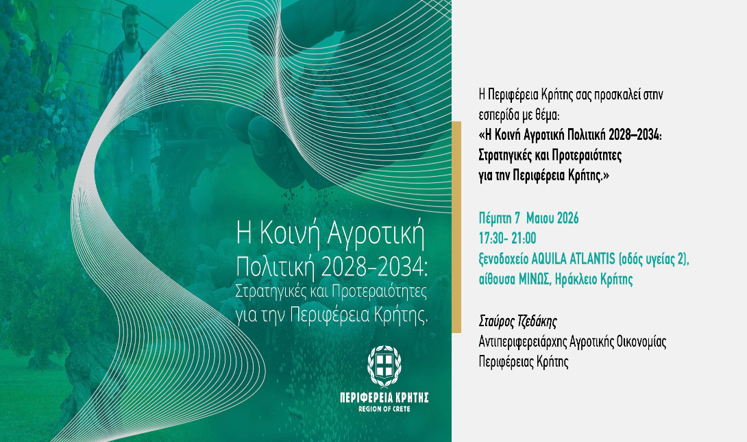 Η Περιφέρεια Κρήτης διοργανώνει εσπερίδα με θέμα: «Η Κοινή Αγροτική Πολιτική 2028–2034: Στρατηγικές και Προτεραιότητες για την Περιφέρεια Κρήτης», την Πέμπτη 7 Μα-ΐου 2026, στις 17:30, στην αίθουσα «ΜΙΝΩΣ» του ξενοδοχείου AQUILA ATLANTIS στο Ηράκλειο.
