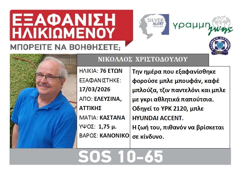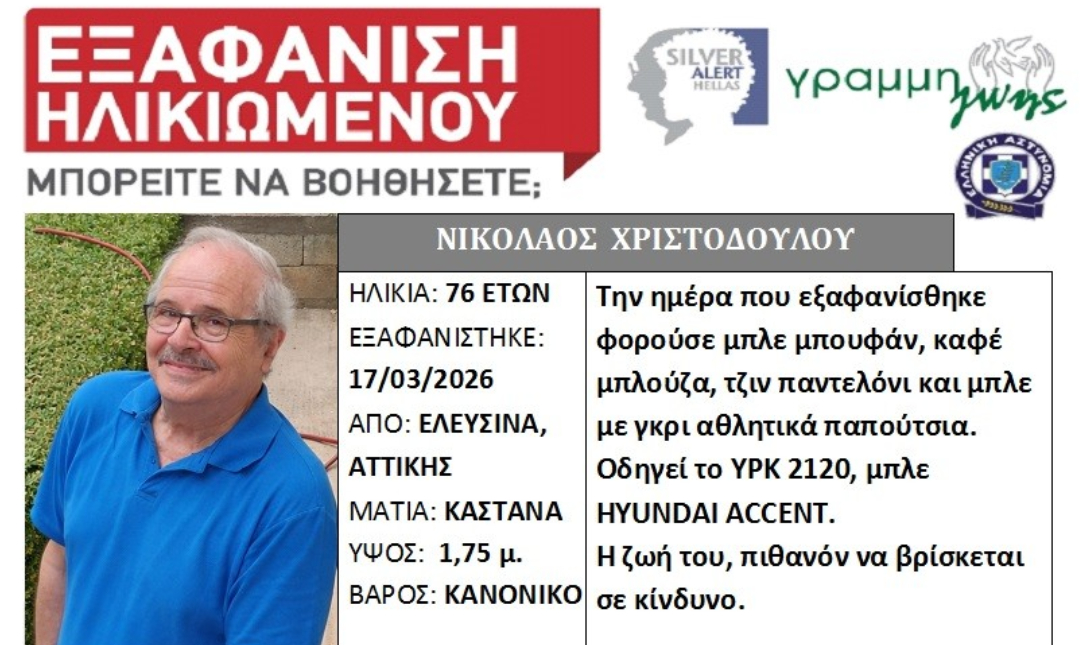 Ο Νικόλαος Χριστοδούλου, 76 ετών, εξαφανίστηκε από το σπίτι του, στην Ελευσίνα Αττικής, το πρωί της 17/03/26, με το αυτοκίνητό του, με αριθμό κυκλοφορίας ΥΡΚ 2120, μάρκας HYUNDAI ACCENT, χρώματος μπλε.