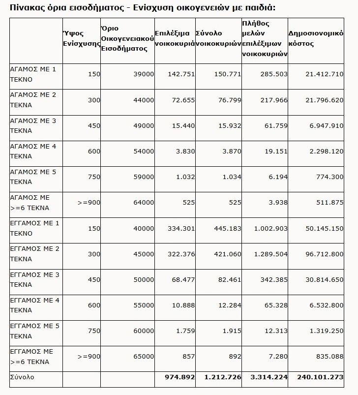 Σε οικογένειες με τρία παιδιά, η ενίσχυση φτάνει τα 450 ευρώ, με όρια εισοδήματος 50.000 ευρώ για έγγαμους και 49.000 ευρώ για μη έγγαμους. Για πολύτεκνες οικογένειες, τα ποσά αυξάνονται σημαντικά, φτάνοντας έως και τα 1.050 ευρώ για επτά παιδιά, με ανώτατο εισόδημα 65.000 ευρώ για έγγαμους και 64.000 ευρώ για μη έγγαμους.