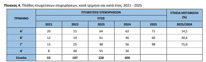 Οι πτωχεύσεις επιχειρήσεων για το σύνολο των τομέων της οικονομίας το τρίτο τρίμηνο του 2025 ανήλθαν σε 98