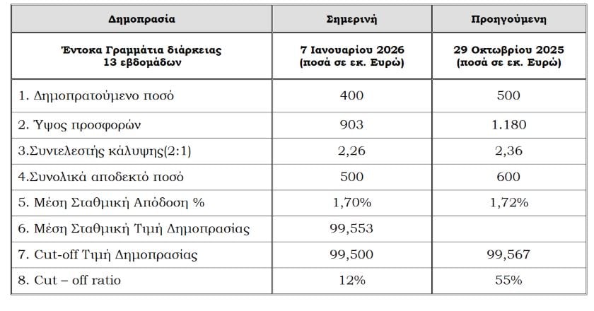 Η δημοπρασία πραγματοποιήθηκε μέσω των Βασικών Διαπραγματευτών Αγοράς (Primary Dealers) και η ημερομηνία διακανονισμού είναι η Παρασκευή 9 Ιανουαρίου 2026.