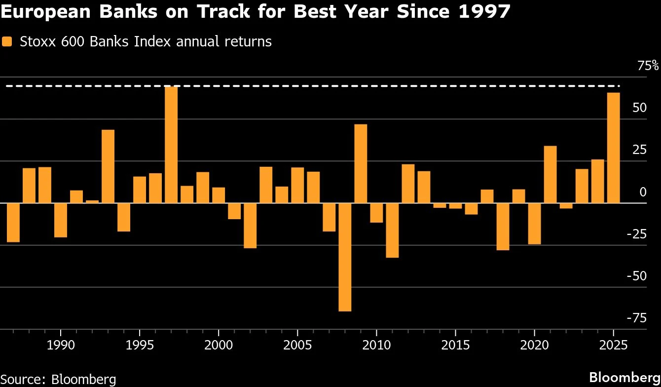 Έτος-ρεκόρ ήταν το 2025 για τα ευρωπαϊκά χρηματιστήρια, καθώς η ενίσχυση των τιμών των μετάλλων και η υπόσχεση για μαζικές αμυντικές δαπάνες έδωσαν ώθηση στις μετοχές. Όμως, οι τράπεζες ήταν αυτές που έκλεψαν την παράσταση, με τους αναλυτές να εκτιμούν ότι το ράλι θα συνεχιστεί και το 2026.