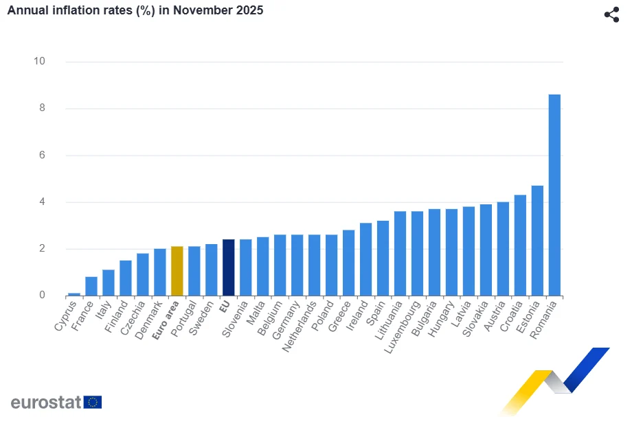 Ο πληθωρισμός στην Ευρωζώνη ανήλθε στο 2,1% τον Νοέμβριο, παραμένοντας αμετάβλητος από τον Οκτώβριο και κοντά στον στόχο της ΕΚΤ. Στην Ε.Ε. υποχώρησε στο 2,4% από 2,5% τον Οκτώβριο.