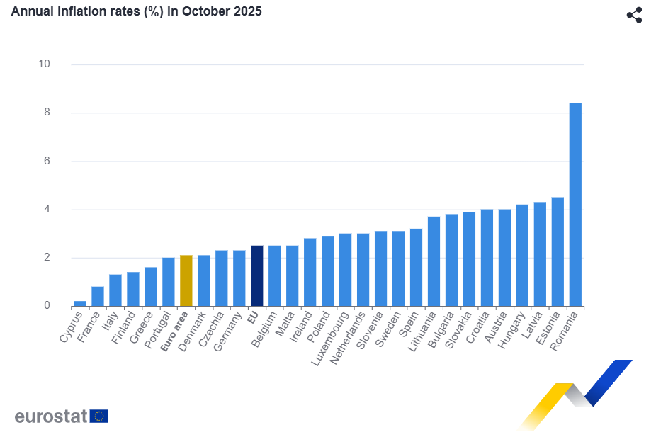 Σημειώνεται ότι σε σύγκριση με την Ε.Ε., η Ελλάδα εμφάνισε τον πέμπτο χαμηλότερο γενικό δείκτη τιμών, μετά την Κύπρο (0,2% σε ετήσια βάση), τη Γαλλία ((0,8%), την Ιταλία (1,3%) και τη Φινλανδία (1,4%). Σε ολόκληρη την Ευρωζώνη, ο πληθωρισμός ανήλθε στο 2,1% τον Οκτώβριο, με τη Eurostat να επιβεβαιώνει την αρχική εκτίμησή της, που σε κάθε περίπτωση «πατάει» στον στόχο της ΕΚΤ.