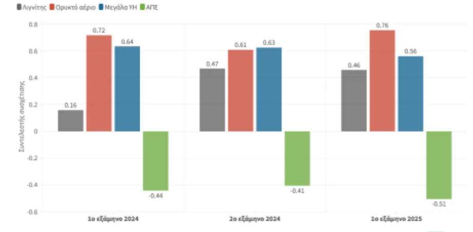 Αντιθέτως, τα ορυκτά καύσιμα (με μέσο μερίδιο κάθε εξάμηνο 6-7% για τον λιγνίτη και 41-46% για το ορυκτό αέριο) εμφανίζουν θετικό συντελεστή συσχέτισης που κυμαίνεται από +0.61 για το αέριο το Β’ εξάμηνο του 2024 έως +0.76 για το αέριο και πάλι το Α’ εξάμηνο του 2025.