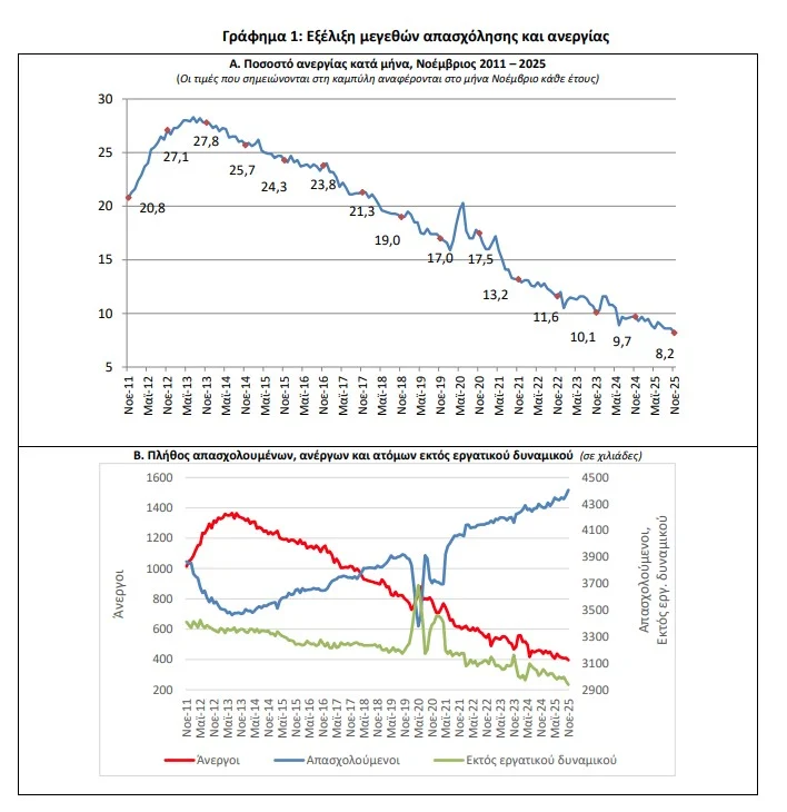 Το εποχικά διορθωμένο ποσοστό ανεργίας τον Νοέμβριο του 2025 ανήλθε σε 8,2% έναντι του αναθεωρημένου προς τα πάνω 9,7% τον Νοέμβριο του 2024, και 8,6% τον Οκτώβριο του 2025.