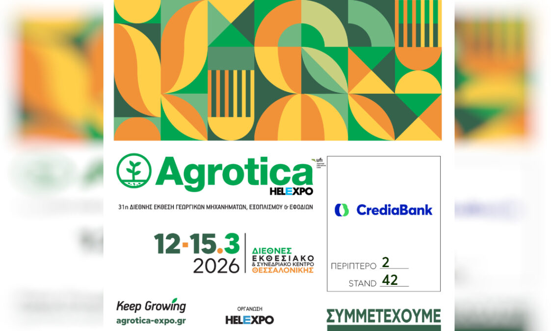 Η CrediaBank θα βρίσκεται στην 31η Διεθνή Έκθεση AGROTICA, την ηγετική έκθεση στην Ελλάδα στον αγροτο-οικονομικό τομέα, από την Πέμπτη 12 έως και την Κυριακή 15 Μαρτίου στο Διεθνές Εκθεσιακό & Συνεδριακό Κέντρο Θεσσαλονίκης (ΔΕΘ HELEXPO). H Τράπεζα θα παρουσιάσει για πρώτη φορά την πρότασή της για τον πρωτογενή τομέα, τη μεταποίησή αγροτικών προϊόντων και τη σύνδεση με την αγροδιατροφή, καθώς και τις συνεργασίες της με διακεκριμένα πανεπιστημιακά ιδρύματα, με στόχο ένα πιο βιώσιμο μέλλον με κοινές δράσεις για τη στήριξη του αγροτικού τομέα.