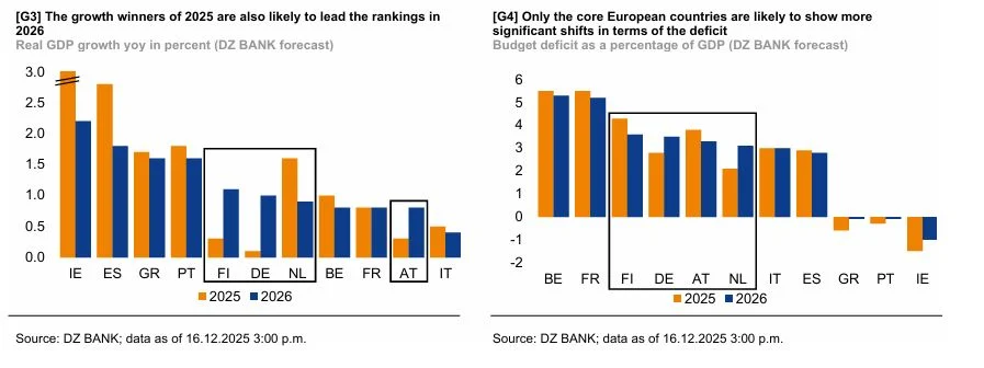 Ειδικότερα, όπως σημειώνει η DZ Bank, οι «νικητές» της ανάπτυξης, και συγκεκριμένα η Ισπανία, η Ελλάδα και η Πορτογαλία, αναμένεται να διατηρήσουν τους τίτλους τους και το 2026. Αντίθετα, το Βέλγιο, η Γαλλία και η Ιταλία δεν αναμένεται να εμφανίσουν σημαντικές αλλαγές στο momentum της ανάπτυξής τους.