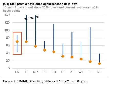 Σε ό,τι αφορά τις πιστοληπτικές αξιολογήσεις, η DZ Bank περιμένει λιγότερες κινήσεις από τους οίκους το 2026. Η Γαλλία εκτιμάται ότι θα υποβαθμιστεί και από τη Γαλλία σε Α1 (στα επίπεδα όπου την έχουν ήδη υποβαθμίσει οι άλλοι δύο οίκοι). Το Βέλγιο θα μπορούσε να αναβαθμιστεί στην κατηγορία του μονού Α.