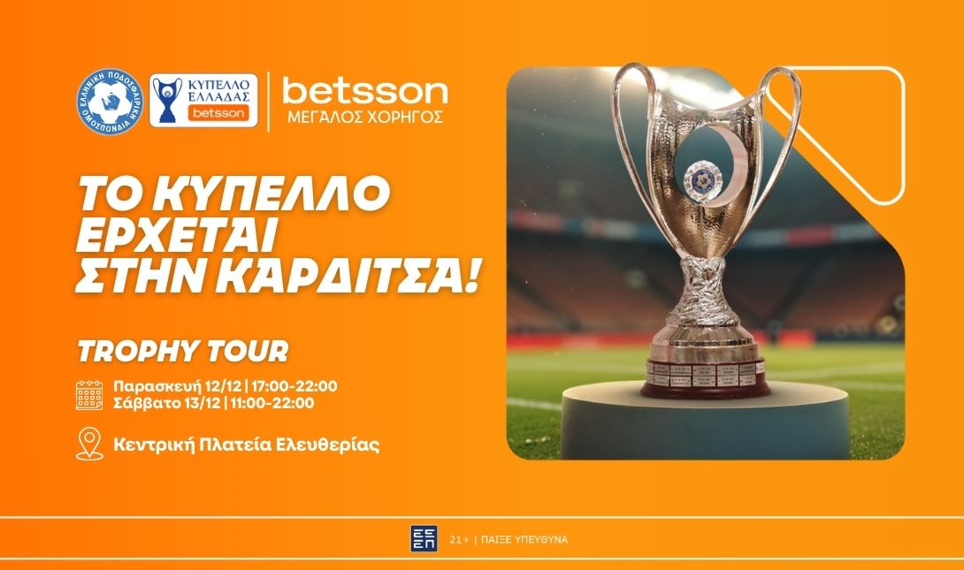 Το ταξίδι του BetssonTrophy Tour συνεχίζεται και, μετά από τρεις δυναμικές στάσεις, η Καρδίτσα ετοιμάζεται να υποδεχθεί το τρόπαιο του Κυπέλλου Ελλάδας Betsson στις 12 και 13 Δεκεμβρίου. Μία πόλη με έντονη αθλητική κουλτούρα γίνεται το επόμενο σημείο συνάντησης για όλους και θα έχουν την ευκαιρία να ζήσουν από κοντά αυτή τη μοναδική εμπειρία.