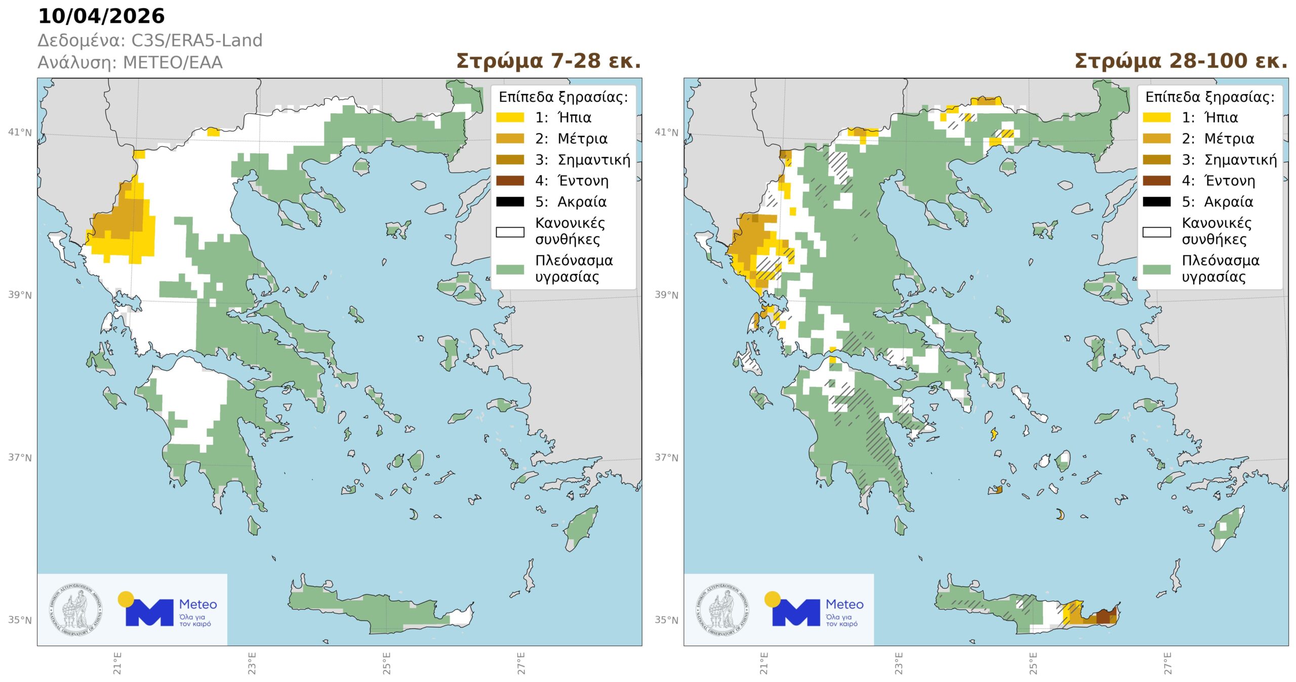 Το παρόν δελτίο παρουσιάζει την ανάλυση της ομάδας ΜΕΤΕΟ του ΕΑΑ για τις συνθήκες ξηρασίας στην Ελλάδα κατά την 10η Απριλίου 2026. Η ανάλυση βασίζεται στην απόκλιση της υγρασίας των στρωμάτων υπεδάφους από τα κανονικά για την εποχή επίπεδα σε δύο στρώματα το επιφανειακό στρώμα 7-28 εκατοστών, όπου η υγρασία εδάφους αποκρίνεται πιο άμεσα στις μετεωρολογικές συνθήκες και διαμορφώνεται κυρίως από τις μετεωρολογικές συνθήκες των τελευταίων εβδομάδων το βαθύτερο στρώμα 28-100 εκατοστών, το οποίο έχει μεγαλύτερη αδράνεια στις μεταβολές του καιρού και αντικατοπτρίζει τις συνθήκες των τελευταίων μηνών.