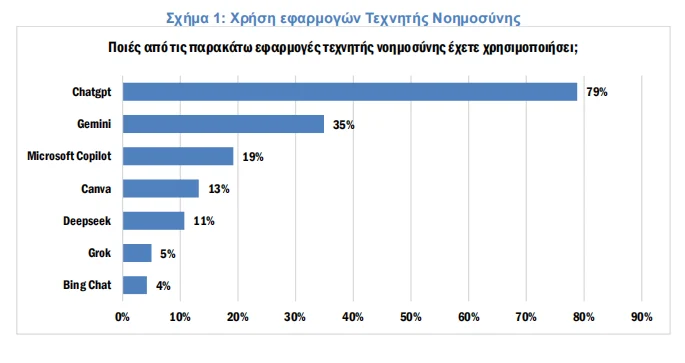 Σε σχέση με τις πιο διαδεδομένες εφαρμογές η μεγαλύτερη χρήση είναι από το ChatGPT – 79% και ακολουθούν Gemini – 35%, Microsoft Copilot – 19%, Canva – 13%, Deepseek – 11%, Grok – 5% και Bing Chat – 4%