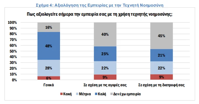 Η εικόνα αυτή περιορίζεται στα επιμέρους πεδία, όπως οι αγορές ή η διατροφή, όπου –αν και σημαντικό μέρος του κοινού δεν έχει ακόμη δοκιμάσει τέτοιες χρήσεις– όσοι το έχουν κάνει εμφανίζονται αρκετά ικανοποιημένοι.