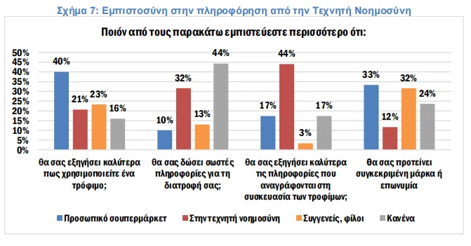 - Για σωστές πληροφορίες διατροφής: Την ΤΝ την εμπιστεύεται το 32%, «κανένα» το 44% και το προσωπικό σούπερ μάρκετ 10%. Σημειώνεται ότι οι επαγγελματίες διατροφής διατηρούν υψηλά ποσοστά, παρότι δεν καταγράφεται σε αυτή την ερώτηση.