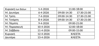 Ο Εμπορικός Σύλλογος Ηρακλείου ανακοίνωσε το πασχαλινό ωράριο λειτουργίας των καταστημάτων, που θα ισχύσει από αύριο Κυριακή 5 Απριλίου έως 13 Απριλίου 2026.