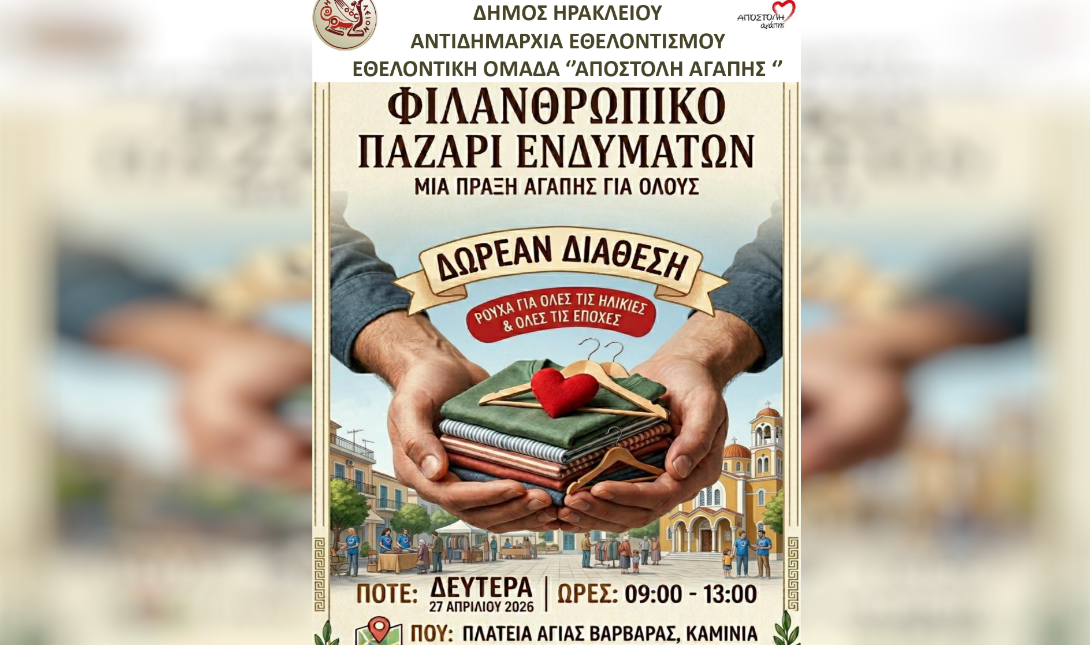 Με σύνθημα «μια πράξη αγάπης για όλους» η Αντιδημαρχία Εθελοντισμού τουΔήμου Ηρακλείου σε συνεργασία με την εθελοντική ομάδα «Αποστολή Αγάπης» διοργανώνουν παζάρι δωρεάν διάθεσης ενδυμάτων την Δευτέρα 27/4 στην πλατεία της Αγίας Βαρβάρας στην περιοχή των Καμινίων από τις 09:00 έως τις 13:00.