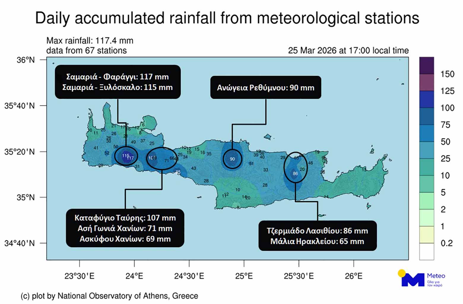 Σύμφωνα με τα στοιχεία από το δίκτυο των 67 αυτόματων μετεωρολογικών σταθμών του νησιού, οι βροχοπτώσεις κατά τη διάρκεια της Τετάρτης 25/03/2026 ήταν κατά τόπους ισχυρές, με το δυτικό και κεντρικό τμήμα του νησιού να δέχεται τον μεγαλύτερο όγκο νερού.