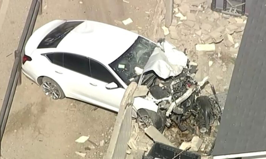 Εναέρια πλάνα που μετέδωσε το δίκτυο KABC καταγράφουν τη στιγμή που το αυτοκίνητο κινείται ανεξέλεγκτα, πριν προσκρούσει σε τοίχο κατοικίας.