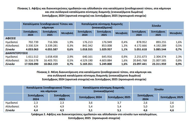 Ειδικότερα, κατά τον μήνα Σεπτέμβριο 2025 σε σύγκριση με τον αντίστοιχο μήνα του 2024, παρατηρήθηκε αύξηση 0,5% στις αφίξεις και 0,8% στις διανυκτερεύσεις των αλλοδαπών.