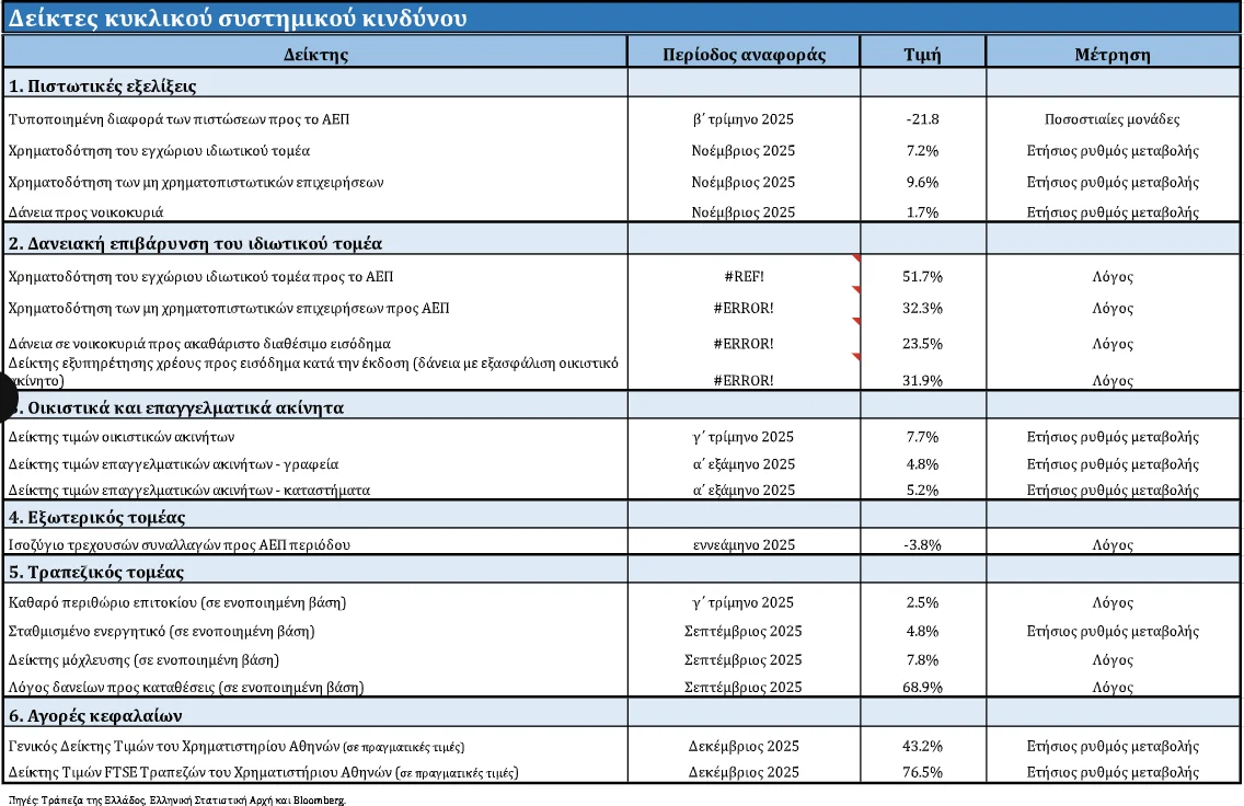 Συμπερασματικά, οι κυκλικοί συστημικοί κίνδυνοι στην Ελλάδα για το α΄ τρίμηνο του 2026 παραμένουν περιορισμένοι και το περιβάλλον κινδύνου εμφανίζεται ουδέτερο.