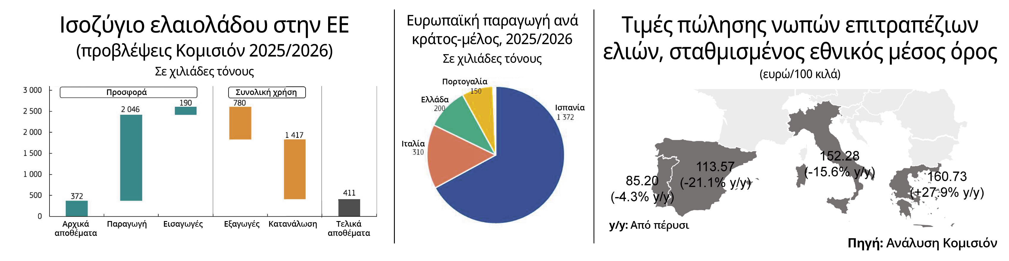 Με τις νέες εκτιμήσεις να προβλέπουν ποσότητα περίπου 3,43 εκατ. τόνων, η παγκόσμια παραγωγή ελαιολάδου επανέρχεται κοντά στον μέσο όρο την περίοδο 2025/2026, σύμφωνα με τα τελευταία στοιχεία της Κομισιόν.