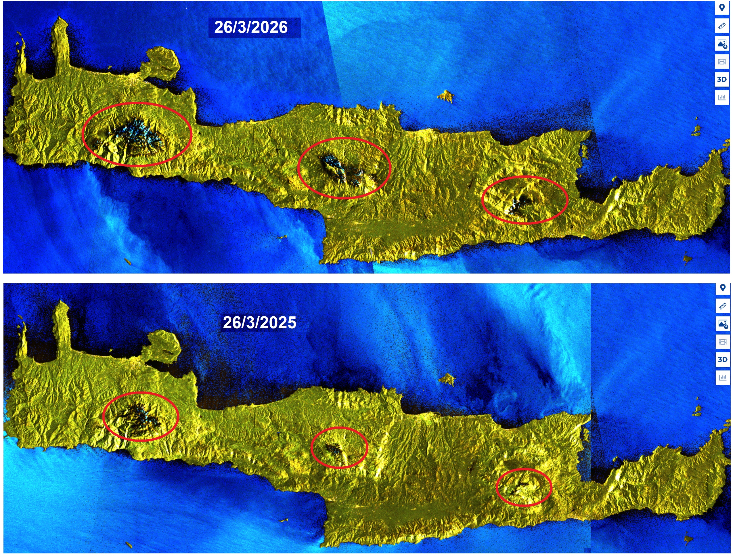 Ενδεικτικά, σε σχέση με τις 26 Μαρτίου 2025, η χιονοκάλυψη φέτος εκτιμάται ότι είναι περίπου τριπλάσια στα Λευκά Όρη, περίπου επταπλάσια στον Ψηλορείτη και φτάνει να είναι έως και δεκαπλάσια στη Δίκτη. Οι διαφορές αυτές υπογραμμίζουν την έντονη παρουσία χειμερινών φαινομένων στα ορεινά της Κρήτης φέτος.