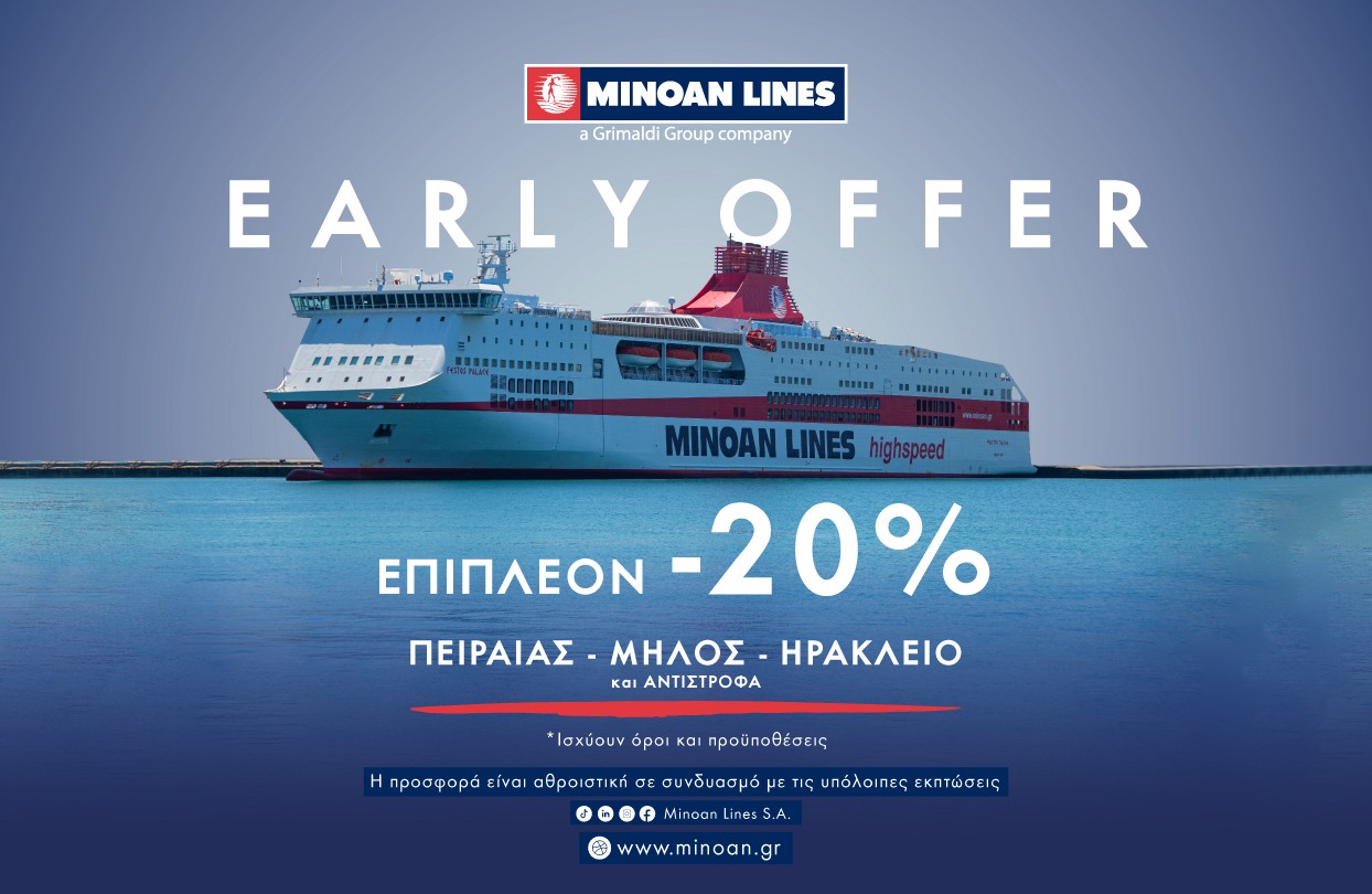 Η MINOAN LINES συνεχίζει να μεριμνά έμπρακτα για τους επιβάτες που την εμπιστεύονται, προσφέροντας 20% επιπλέον έκπτωση για κρατήσεις που θα πραγματοποιηθούν έως τις 15 Φεβρουαρίου στα δρομολόγια Πειραιάς – Μήλος – Ηράκλειο και αντίστροφα, και θα αφορούν σε ταξίδια έως τις 31 Οκτωβρίου 2026. Η έκπτωση EARLY OFFER 2026 της εμβληματικής ελληνικής ακτοπλοϊκής εταιρίας που για περισσότερα από 50 χρόνια συνδέει προορισμούς και ανθρώπους, είναι αθροιστική με τις υπόλοιπες εκπτώσεις της εμπορικής πολιτικής και αφορά στις κατηγορίες Οικονομική Θέση, VIP και Τετράκλινη Εσωτερική Καμπίνα (AB4).