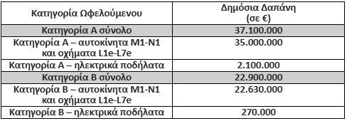 Οι νέοι πόροι κατευθύνονται στις επιδοτήσεις οχημάτων νομικών προσώπων (κατηγορία Β) και ποδηλάτων φυσικών προσώπων (Κατηγορία Α).
