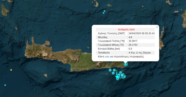 Νέος σεισμός, εντάσεως 5 Ρίχτερ, σύμφωνα με την πρώτη μέτρηση του Γεωδυναμικού Ινστιτούτου έγινε αισθητός στην Κρήτη, δύο λεπτά πριν τις 12.00 το μεσημέρι της Παρασκευής. Η δόνηση είχε και πάλι επίκεντρο την θαλάσσια περιοχή νοτιοανατολικά του Γούδουρα Σητείας.