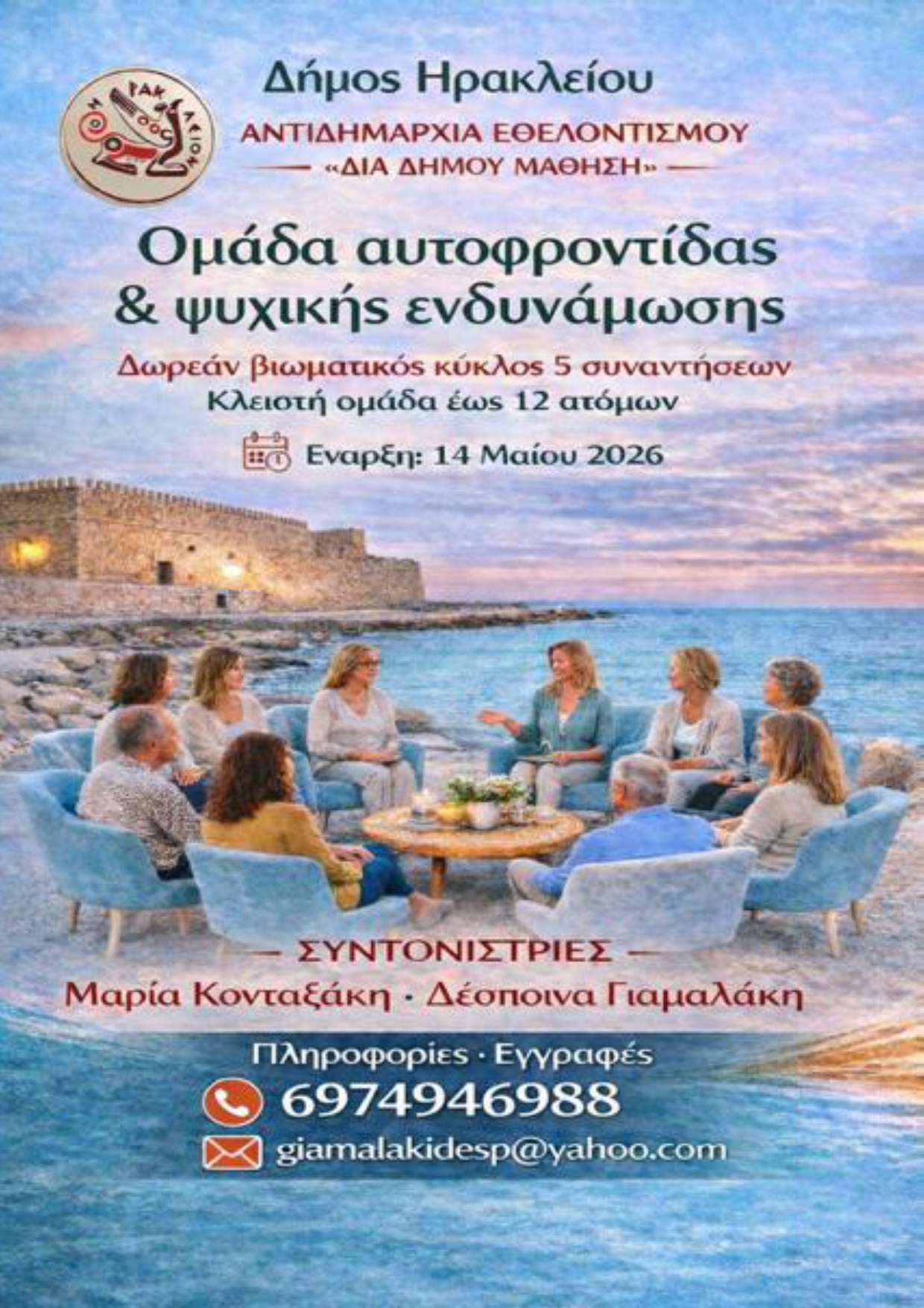 Ο Δήμος Ηρακλείου μέσω της Αντιδημαρχίας Εθελοντισμού διοργανώνει ένα νέο κύκλο βιωματικών συναντήσεων της δράσης «Ομάδα αυτοφροντίδας και ψυχικής ενδυνάμωσης», στο πλαίσιο της Δια… Δήμου Μάθηση, με ελεύθερη συμμετοχή και έναρξη από 14 Μαΐου 2026.