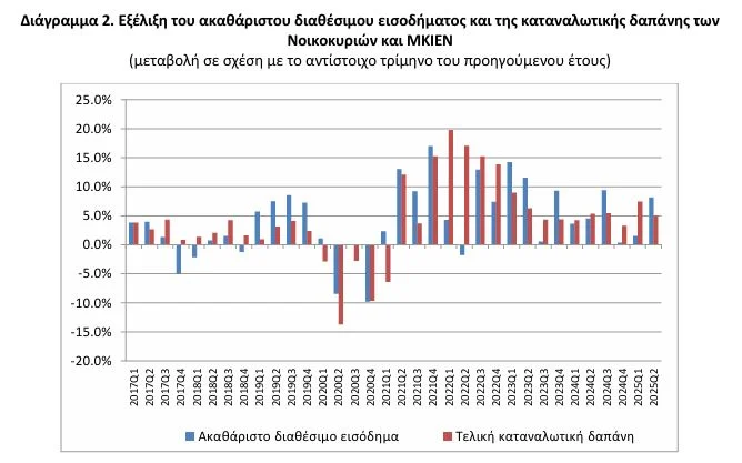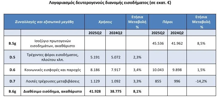 Αύξηση 8,1% εμφάνισε το διαθέσιμο εισόδημα των νοικοκυριών και των μη κερδοσκοπικών ιδρυμάτων που εξυπηρετούν νοικοκυριά κατά το δεύτερο τρίμηνο του 2025, καθώς διαμορφώθηκε από 38,77 δισ. ευρώ το αντίστοιχο περσινό διάστημα, σε 41,93 δισ. ευρώ.