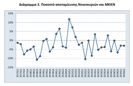 Το ποσοστό αποταμίευσης των νοικοκυριών και των ΜΚΙΕΝ (ορίζεται ως η ακαθάριστη αποταμίευση προς το ακαθάριστο διαθέσιμο εισόδημα), ήταν -3% κατά το 2ο τρίμηνο του 2025, σε σύγκριση με -6,1% το 2ο τρίμηνο του 2024.