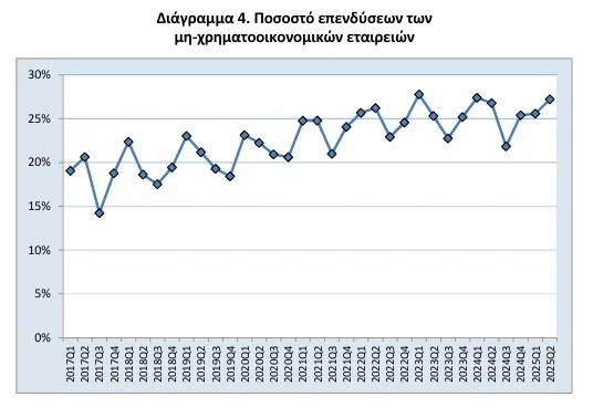 Κατά το 2ο τρίμηνο του 2025, οι ακαθάριστες επενδύσεις παγίου κεφαλαίου του τομέα των μη χρηματοοικονομικών εταιρειών ανήλθαν στο ποσό των 5,6 δισ. ευρώ.