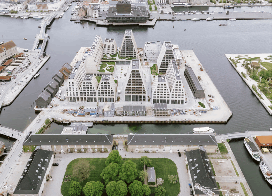 Το αρχιτεκτονικό γραφείο Cobe είναι αυτό που ανέλαβε το έργο το 2018 και γρήγορα μετατράπηκε από βιομηχανική σε αστική περιοχή, παίρνοντας τον τίτλο για το τέταρτο πιο δημοφιλές τουριστικό αξιοθέατο στη Δανία. Αυτός ο ιδιαίτερος σχεδιασμός δημιουργεί μια οικεία και προστατευμένη αυλή, η οποία χρησιμεύει ως ιδιωτικός κήπος στον τελευταίο όροφο και ως δημόσιος χώρος πρασίνου στο ισόγειο. Γύρω από το νησί υπάρχει ένας μεγάλος δημόσιος παραλιακός δρόμος με μικρούς χώρους, χαμηλωμένες ξύλινες πλατφόρμες για σκάφη και μια δημόσια πισίνα, που φιλοξενεί χιλιάδες επισκέπτες σε αυτό το μπλε αστικό σαλόνι.