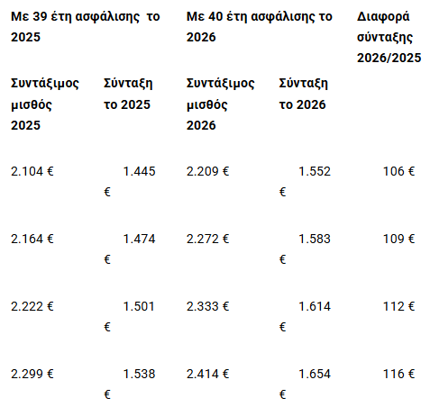 Μεγαλύτερες σε σχέση με το 2025 θα είναι οι συντάξεις για τους ασφαλισμένους που σκοπεύουν να συνταξιοδοτηθούν το 2026 ακόμη και αν αποχωρήσουν με τα ίδια χρόνια ασφάλισης που συνταξιοδοτήθηκαν οι ασφαλισμένοι το 2025.