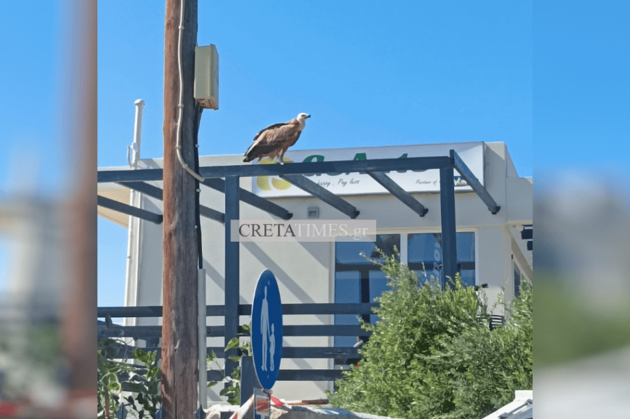 Πάνω στην πέργκολα ενός ξενοδοχείου στους Καθαράδες στην Ιεράπετρας, 8 χιλιόμετρα έξω από την πόλη στο δρόμο για Σητεια, βρίσκεται ακίνητος ένας γυπαετός