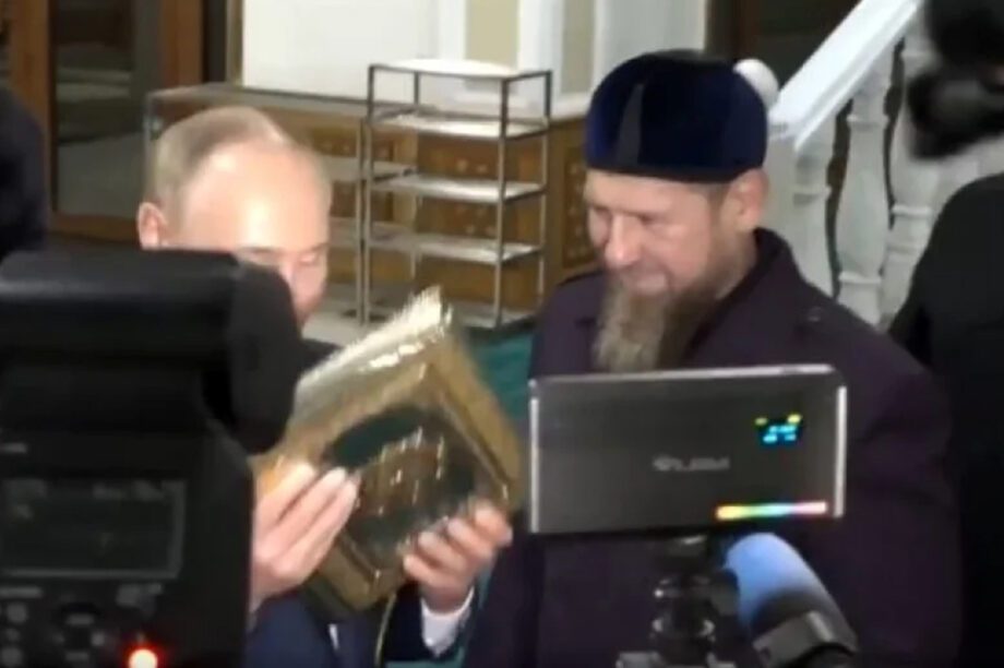 Ο Καντίροφ του δωρίζει ένα επικαλυμμένο με χρυσό Κοράνι και ο Πούτιν σκύβει και το φιλάει.