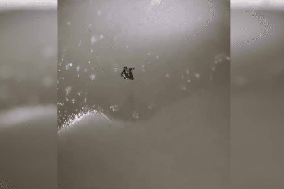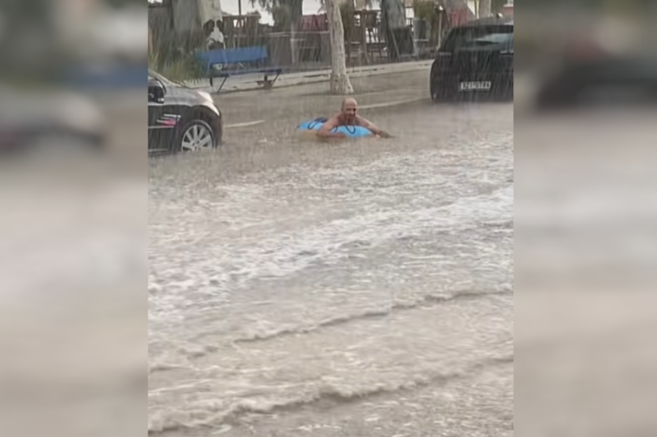 Ο άνδρας φορώντας το μαγιό του, δείχνει να το απολαμβάνει και να ρίχνει και νερό στο πρόσωπο του όπως ήταν ξαπλωμένος μπρούμυτα