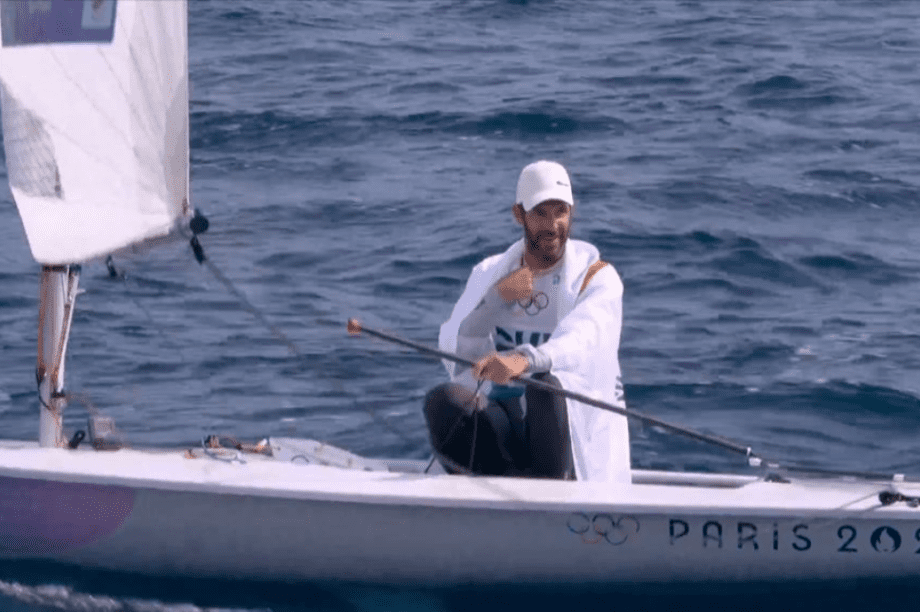 Η απονομή του χρυσού μεταλλίου στον Μίλτο Τεντόλου, για την πρώτη θέση στο μήκος στους Ολυμπιακούς Αγώνες του Παρισιού