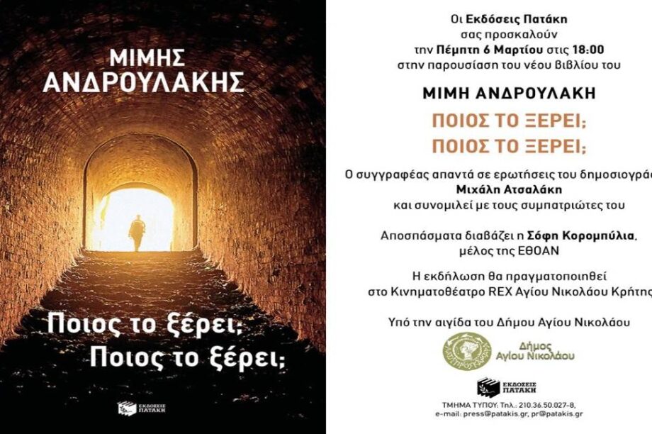 Η εκδήλωση διοργανώνεται από τον Δήμο Αγίου Νικολάου σε συνεργασία με τις εκδόσεις Πατάκη