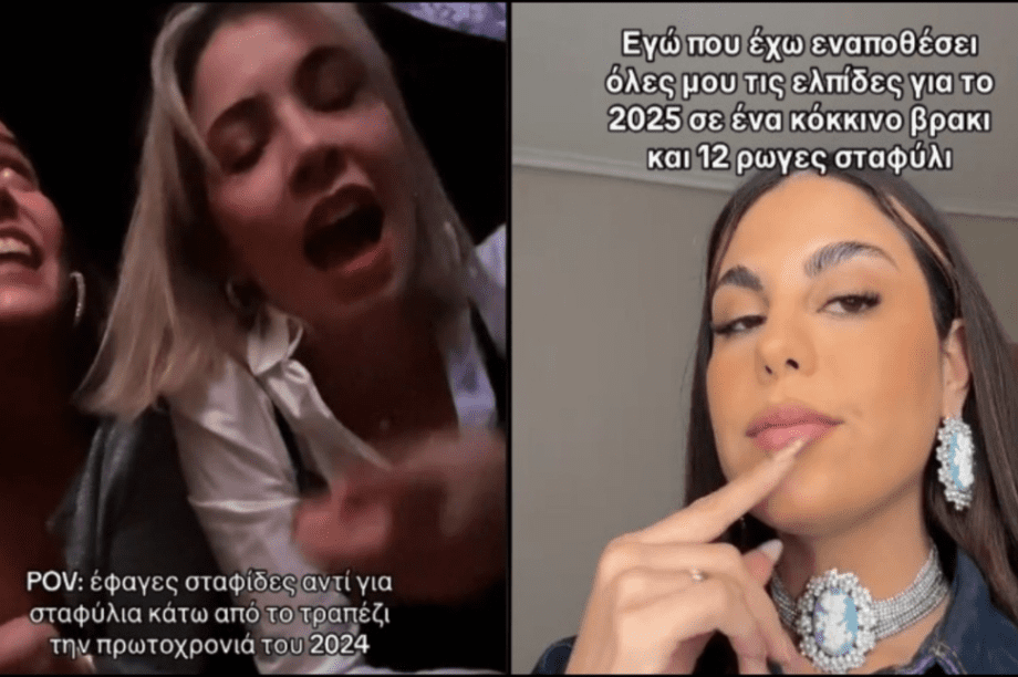 Viral έχουν γίνει τα βίντεο από την Πρωτοχρονιά που δείχνουν νεαρές γυναίκες να τρώνε σταφύλια κάτω από το τραπέζι