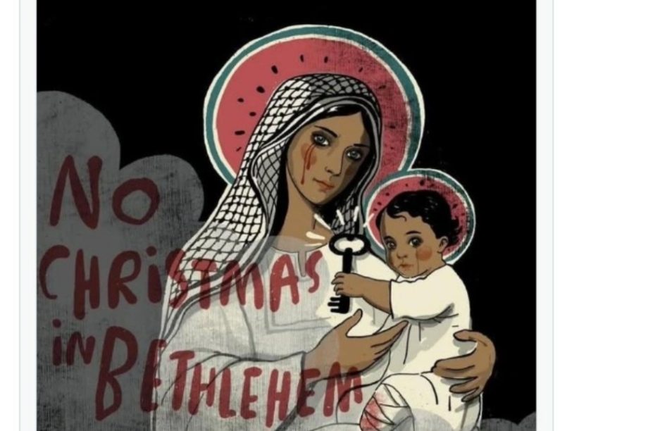 Η Παρθένος έχει αντικατασταθεί από Παλαιστίνια η οποία κρατάει στην αγκαλιά της ένα παιδί με ακρωτηριασμένο πόδι