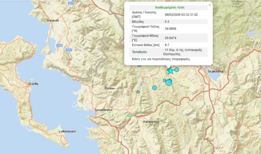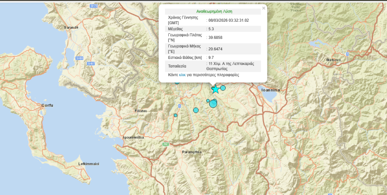 Σεισμική δόνηση μεγέθους 5,4 βαθμών της κλίμακας Ρίχτερ καταγράφηκε τα ξημερώματα της Κυριακής 8 Μαρτίου 2026, σύμφωνα με τα στοιχεία που εμφανίζονται στην αυτόματη λύση του Γεωδυναμικού Κέντρου.